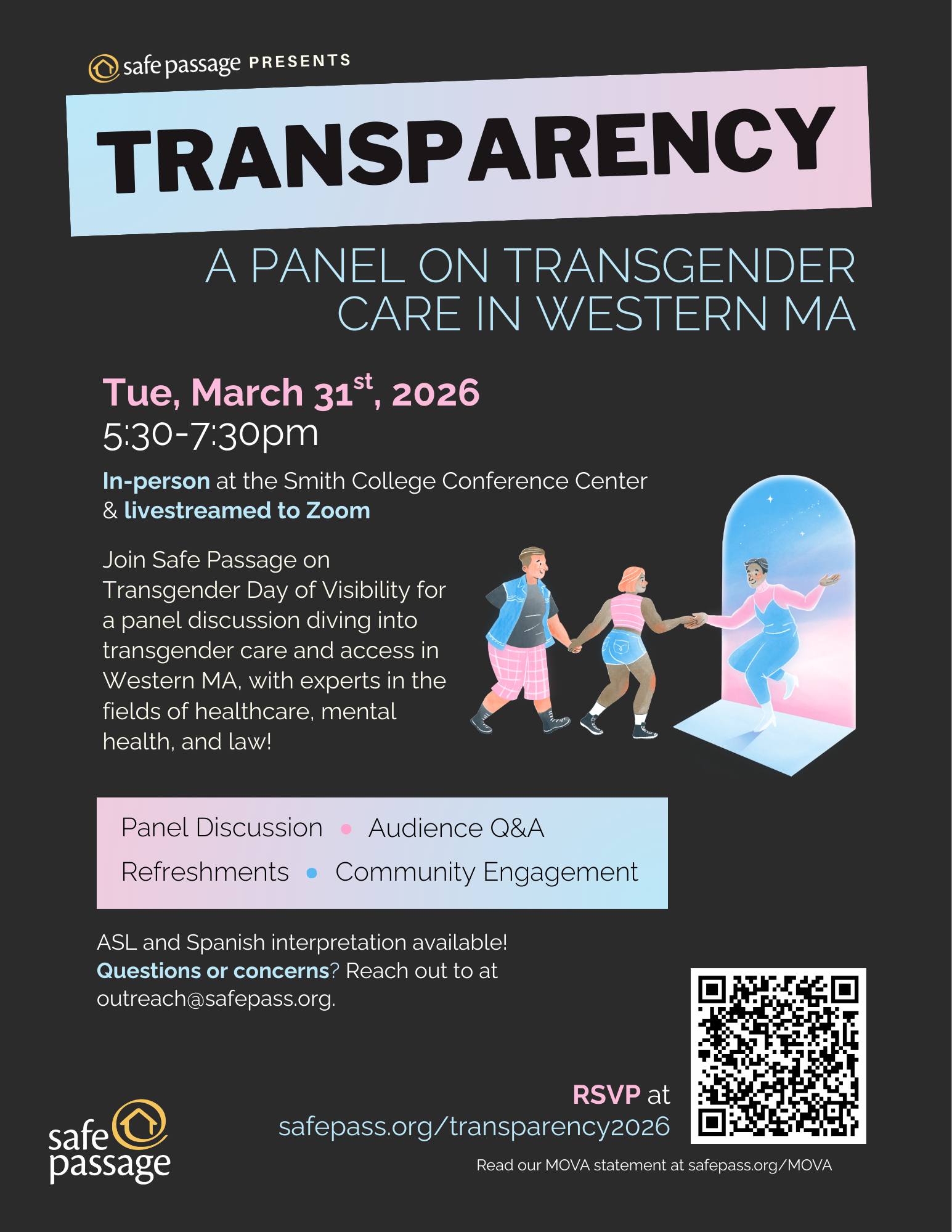 Overview Join us for a real talk panel on transgender healthcare issues in Western MA—let’s get transparent! Join Safe Passage on Transgender Day of Visibility for an in-person and online panel discussion diving into transgender care in Western Massachusetts. This event brings together experts in healthcare, mental health, and law, as well as and community […] |